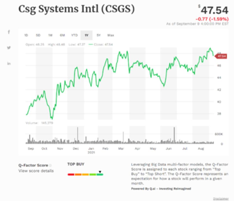 Csg Systems Intl Inc is our first Top Buy today. The company provides business support systems software and services, primarily to the telecommunications industry. Our AI systems rated Csg Systems B in Technicals, C in Growth, A in Low Volatility Momentum, and A in Quality Value. The stock closed down 1.59% to $47.54 on volume of 145,279 vs its 10-day price average of $48.21 and its 22-day price average of $47.53, and is up 5.86% for the year. Revenue grew by 2.25% in the last fiscal year and grew by 15.75% over the last three fiscal years, Operating Income grew by 17.84% over the last three fiscal years, and EPS grew by 12.02% in the last fiscal year and grew by 1.43% over the last three fiscal years. Revenue was $990.53M in the last fiscal year compared to $875.06M three years ago, Operating Income was $133.9M in the last fiscal year compared to $113.59M three years ago, EPS was $1.82 in the last fiscal year compared to $2.01 three years ago, and ROE was 14.34% in the last year compared to 18.79% three years ago. Forward 12M Revenue is expected to grow by 0.24% over the next 12 months, and the stock is trading with a Forward 12M P/E of 14.54.