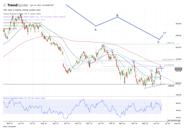 Right now, FedEx stock faces an enormous hurdle. It’s trading into the 50% retracement of the current range, trying to clear last month’s high at $226.33, the declining 200-day moving average and the weekly VWAP measure.