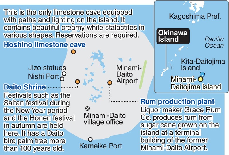 Minami-Daitojima island is located in the Pacific Ocean about 360 kilometers east of Okinawa Island. On Jan. 23, 1900, 23 early settlers from Hachijojima landed on Minami-Daitojima, which has a circumference of about 20 kilometers. Until then, Minami-Daitojima had been an uninhabited island covered by primary forests of palm trees called Daito biro.
