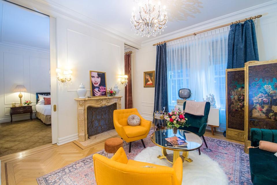 Bookable for two guests, this luxe one-bedroom suite comes with a separate parlor room with vintage and modern replica furnishings and accoutrements reflecting the show’s respective decades.