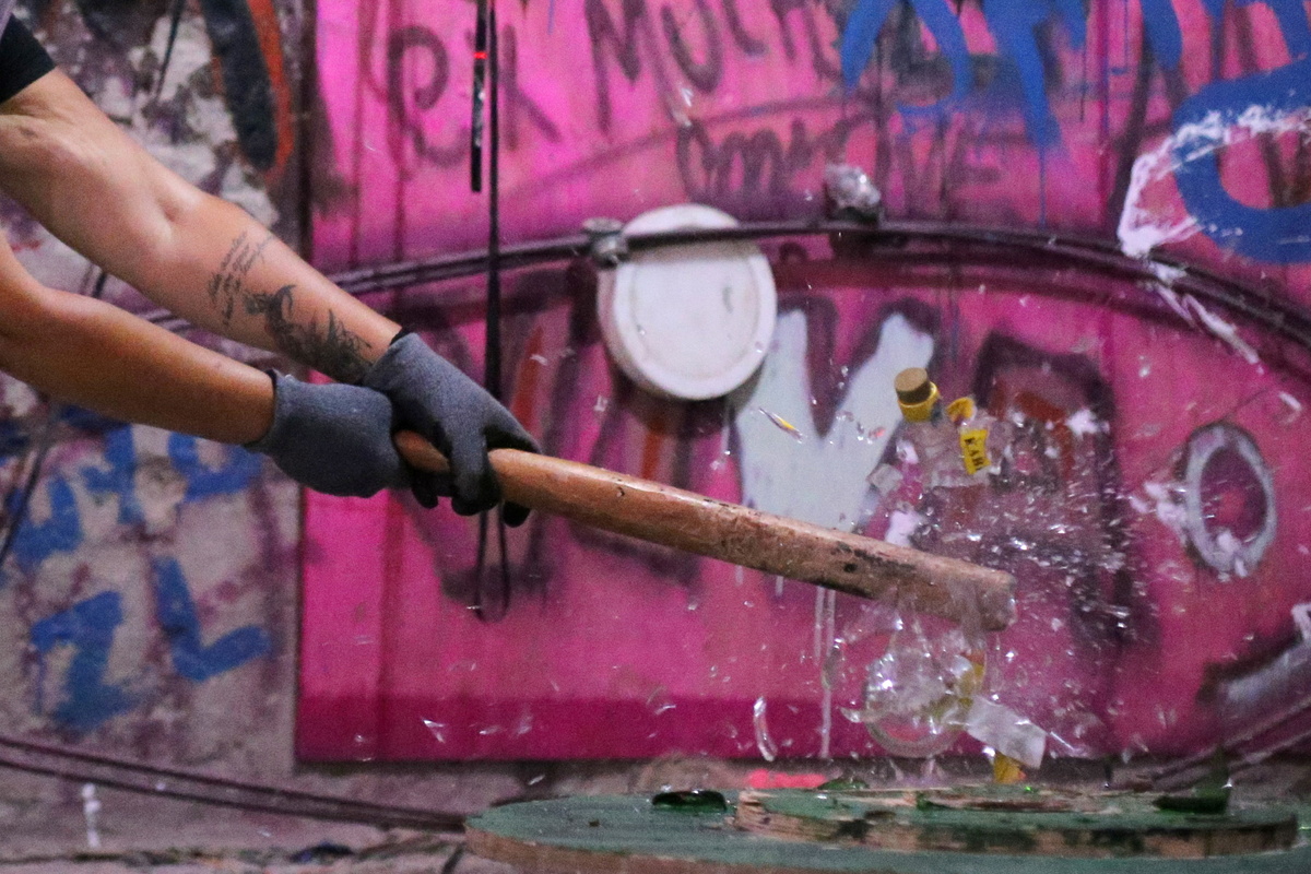 Inside a warehouse on the outskirts of Sao Paulo, people are able to swing giant hammers at old televisions, computers and printers, demolishing the machines, and shattering the glass into tiny pieces.