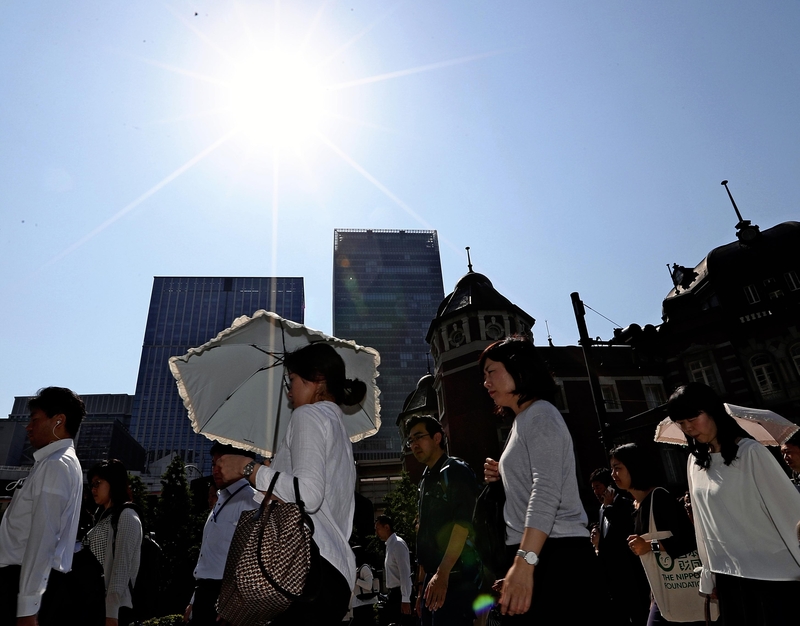The sun beams down as commuters walk near JR Tokyo Station on Friday as a high-pressure system hit Japan, pushing the mercury up in the morning hours to a midsummer-like level nationwide. High temperatures are expected to peak on Sunday and continue early into the week. The Japan Meteorological Agency also issued heatstroke warnings. The temperature reached 30.2 C at noon in central Tokyo, exceeding 30 C for the first time this year, according to the agency.