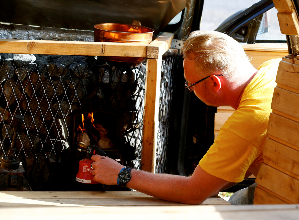 To use the sauna, Maesalu, 29, puts a chimney in the bonnet, fires up the wood stove, and heats the sauna to 60 degrees Celsius (140 degrees Fahrenheit). If it got any hotter, the windows might crack.