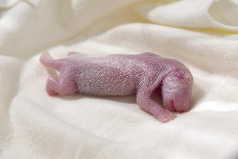The new cub was born to father Eimei, 25, and mother Rauhin, 17, on Tuesday night. The 15.5-centimeter baby weighed 75 grams, making her the smallest of all the pandas born at Adventure World.