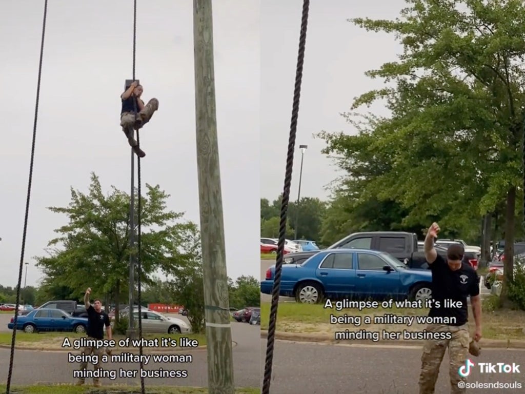 In the video, which was posted earlier this month by a woman who goes by the username @solesndsouls on TikTok, she can be seen climbing a rope while dressed in military fatigues.