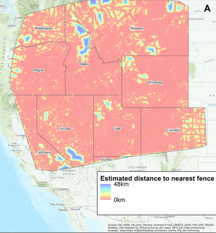 To demonstrate this point, we looked more closely at the western U.S., which is known for huge open spaces but also is the homeland of barbed wire fencing. Our analysis shows that vast areas viewed by researchers as relatively untrodden by the human footprint are silently entangled in dense networks of fences.