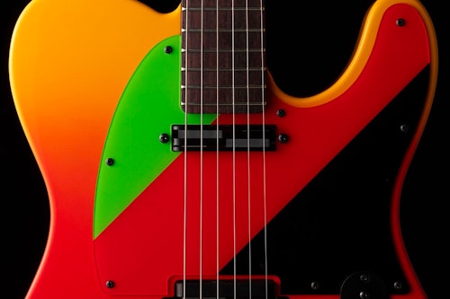 The Telecaster's body is done up in orange, red, and green — just like the character Asuka Langley Soryu's plug suit and EVA 2. A special "NERV" plaque appears on the neck plate, while an "EVA 2" logo adorns the fretboard. Rounding out the guitar components are aluminum pickups and a matte-black neck that matches the hardware. It also comes with an NERV-branded case and sticker, as well as a certificate with original artwork of Asuka in her plug suit holding her guitar.