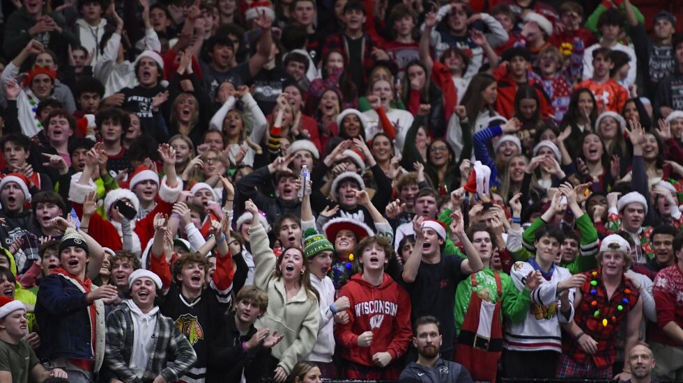 The matchup is one of the fixtures of the annual event, bringing out huge student sections for both schools: Oak Park’s a sea of orange and Fenwick’s almost all wearing ugly Christmas sweaters and Santa hats.