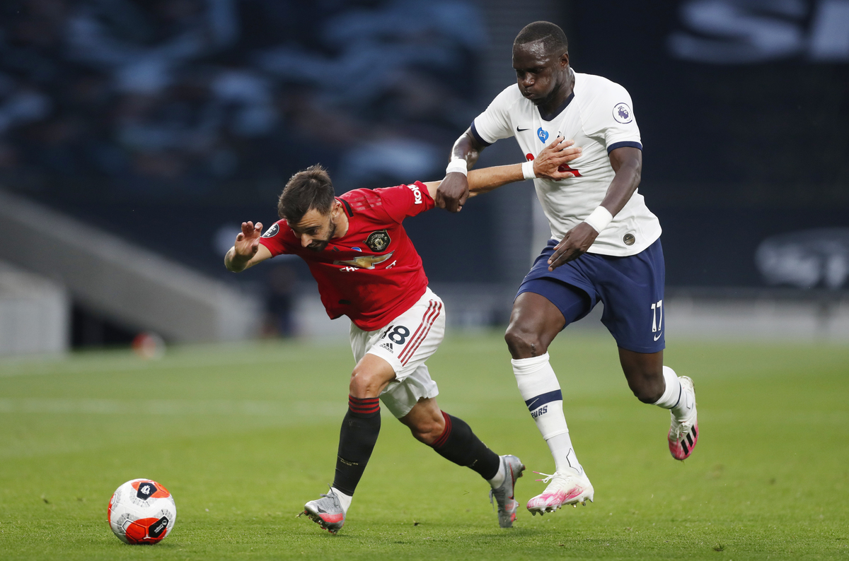 Soccer Football - Premier League - Tottenham Hotspur v Manchester United - Tottenham Hotspur Stadium, London, Britain - June 19, 2020 Manchester United's Bruno Fernandes in action with Tottenham Hotspur's Moussa Sissoko, as play resumes behind closed doors following the outbreak of the coronavirus disease (COVID-19) REUTERS / Matthew Childs / Pool