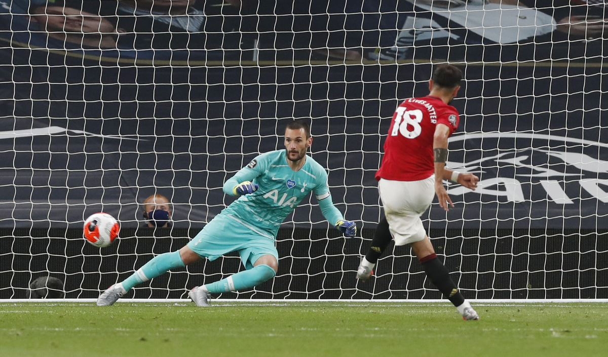 Soccer Football - Premier League - Tottenham Hotspur v Manchester United - Tottenham Hotspur Stadium, London, Britain - June 19, 2020 Manchester United's Bruno Fernandes scores their first goal from the penalty spot, as play resumes behind closed doors following the outbreak of the coronavirus disease (COVID-19) REUTERS / Matthew Childs / Pool