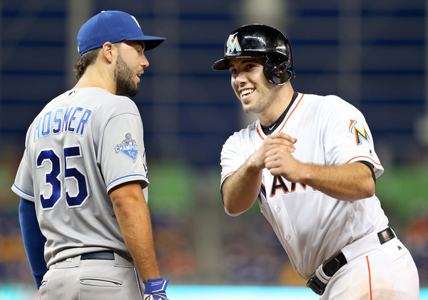 Christian Yelich's two-run single produced the first Miami runs of the series and chased Kansas City starter Dillon Gee after 5 1/3 innings.