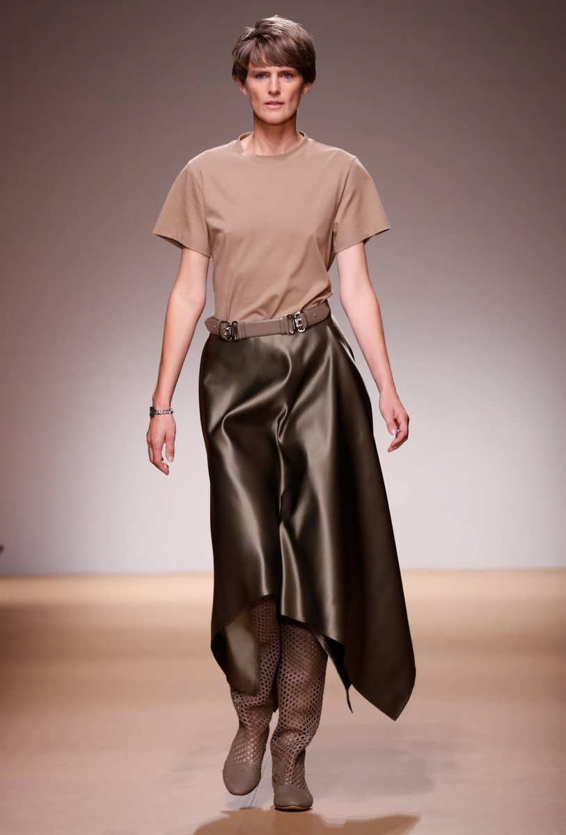 British model Stella Tennant opened the show, hosted as usual in Milan's stock exchange building, wearing an olive- coloured satin handkerchief skirt under a taupe t-shirt, and leather woven boots.