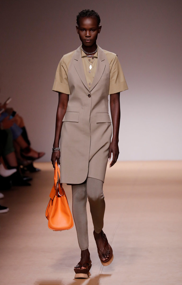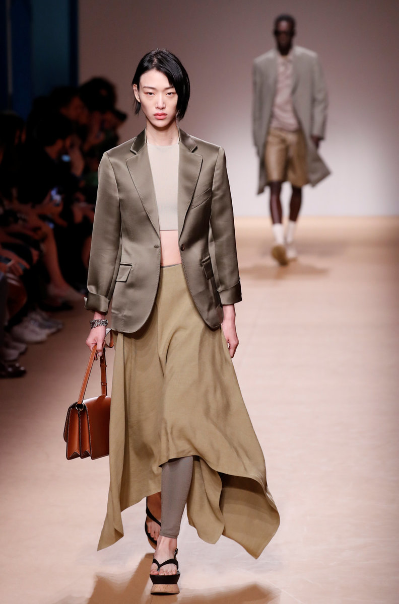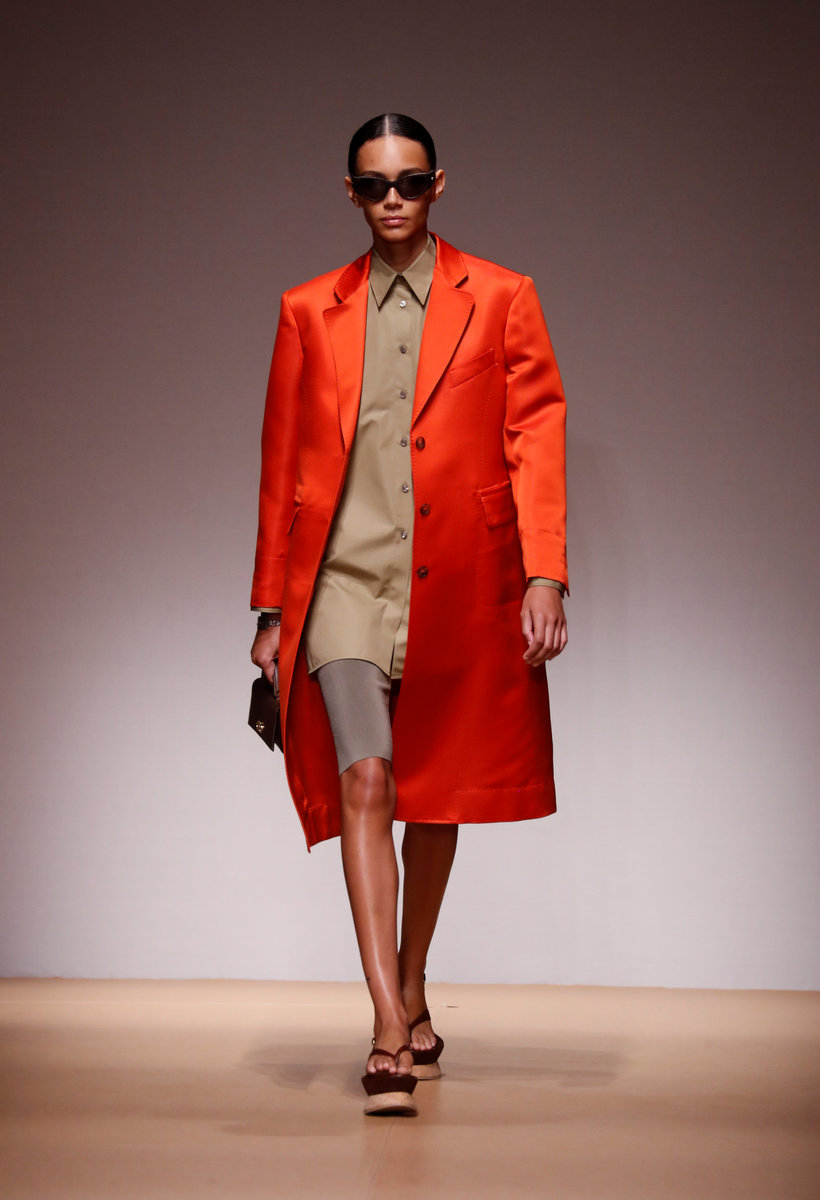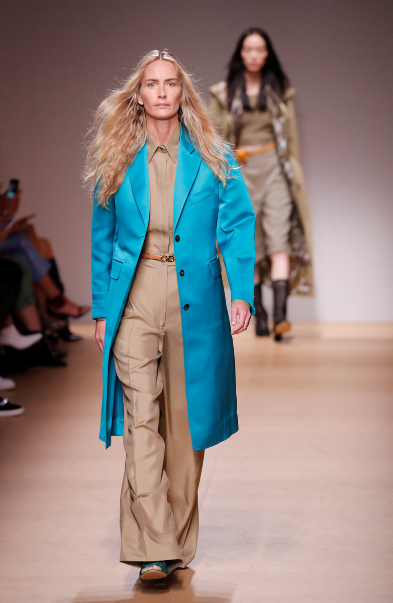 Bold tones of emerald, indigo, orange, red and violet popped out "as punctuation" among the taupe, caramel, biscuit beige, khaki and olive green, in clothes and accessories designed for both men and women.