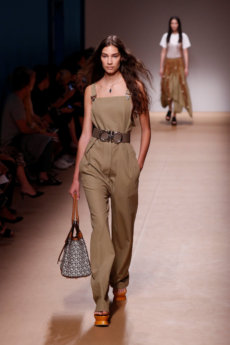 Models wore wooden clogs, raised sandals and knee-high woven leather boots, and carried the new 'All Gancini Ferragamo Studio' bag and microbags slung over their shoulder.