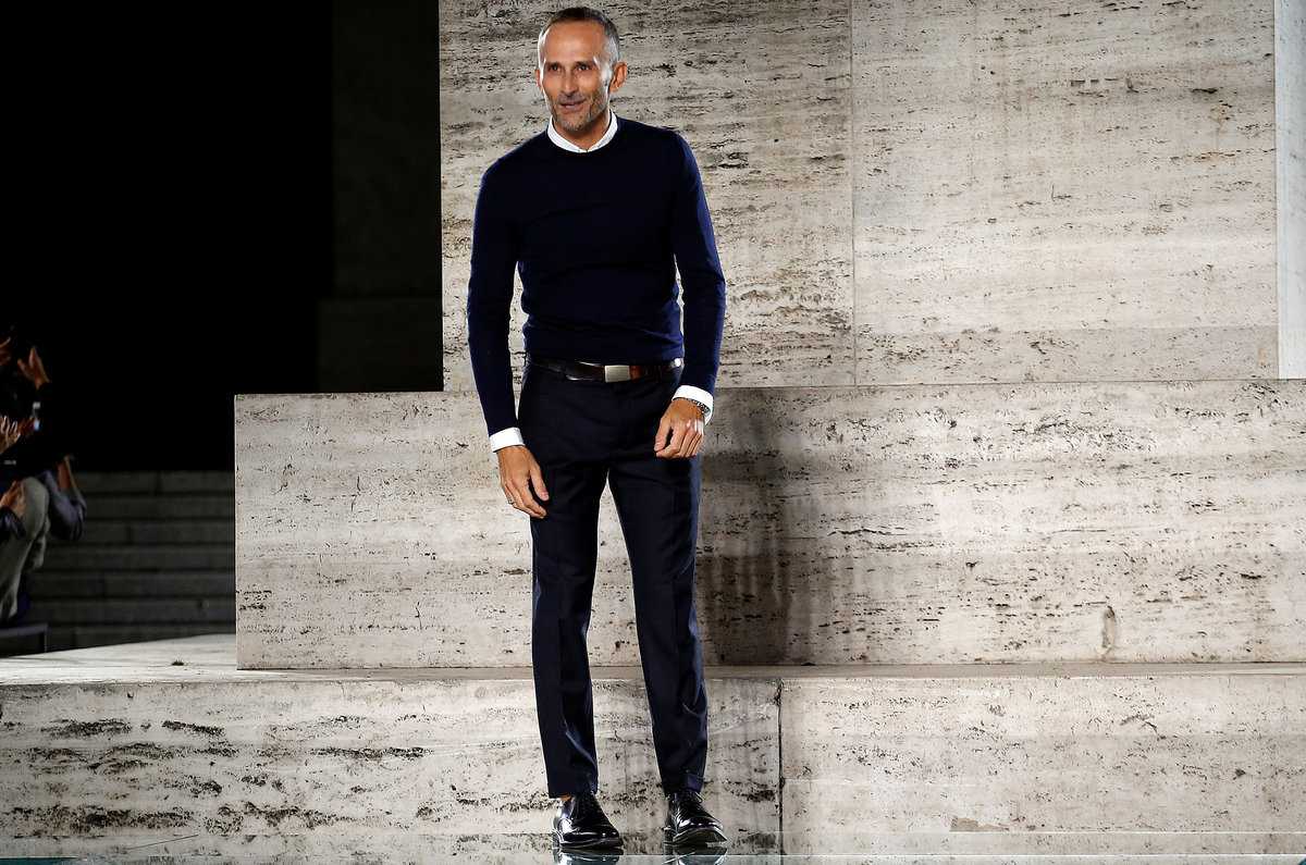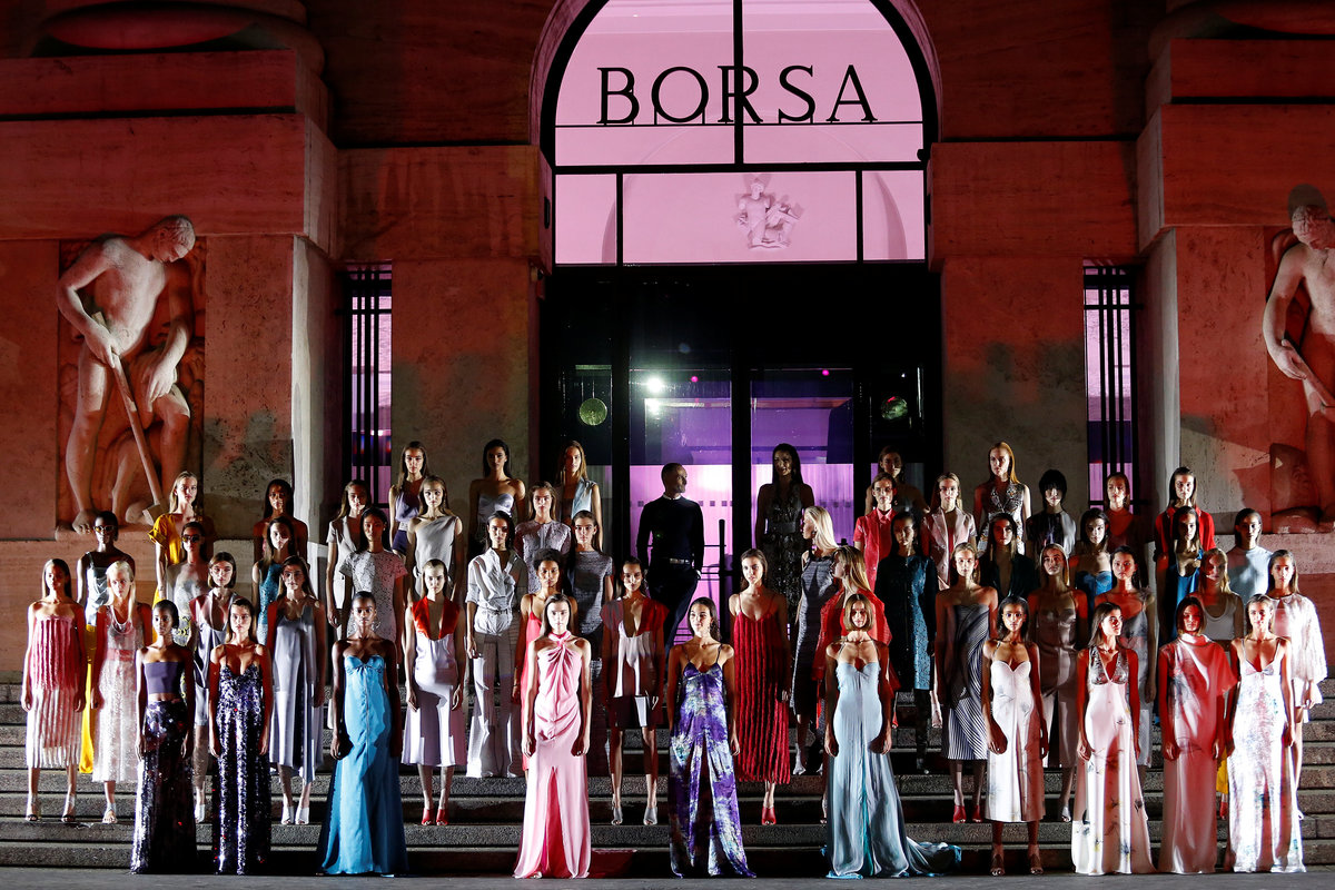 In the finale, models, followed by Rigoni, walked away from the garden-turn-runway to the steps of the stock exchange, whose facade was used for a light show by German designer Ingo Maurer.