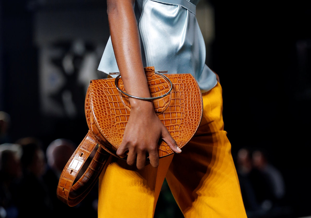 The looks were matched with peep-toe sandals with golden chunky heels and capri sandals laced up with silk foulards and small leather bags with thin geometric bracelet-like handles.