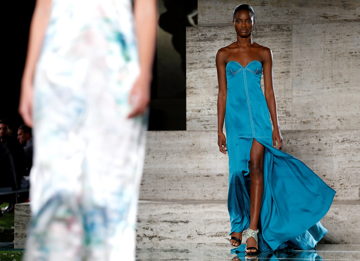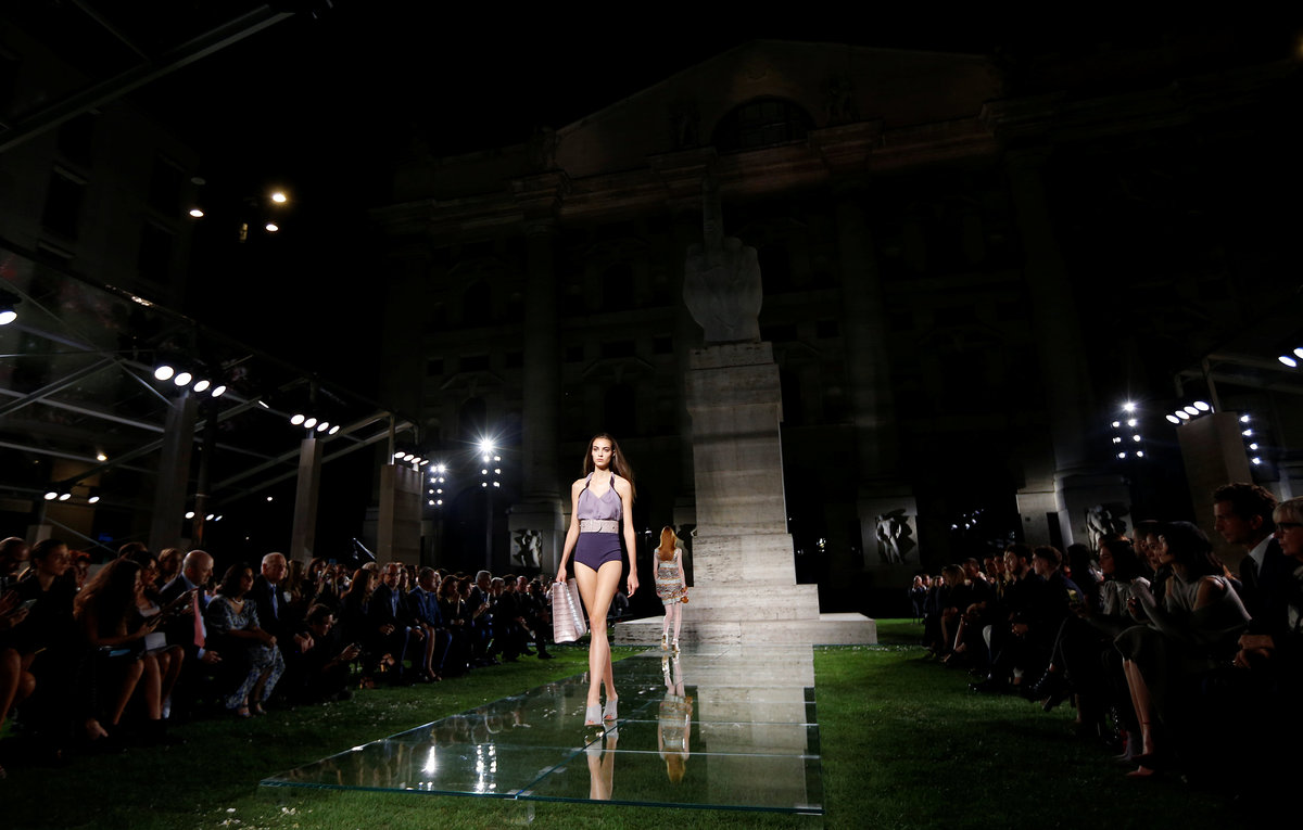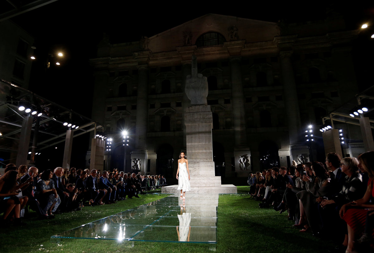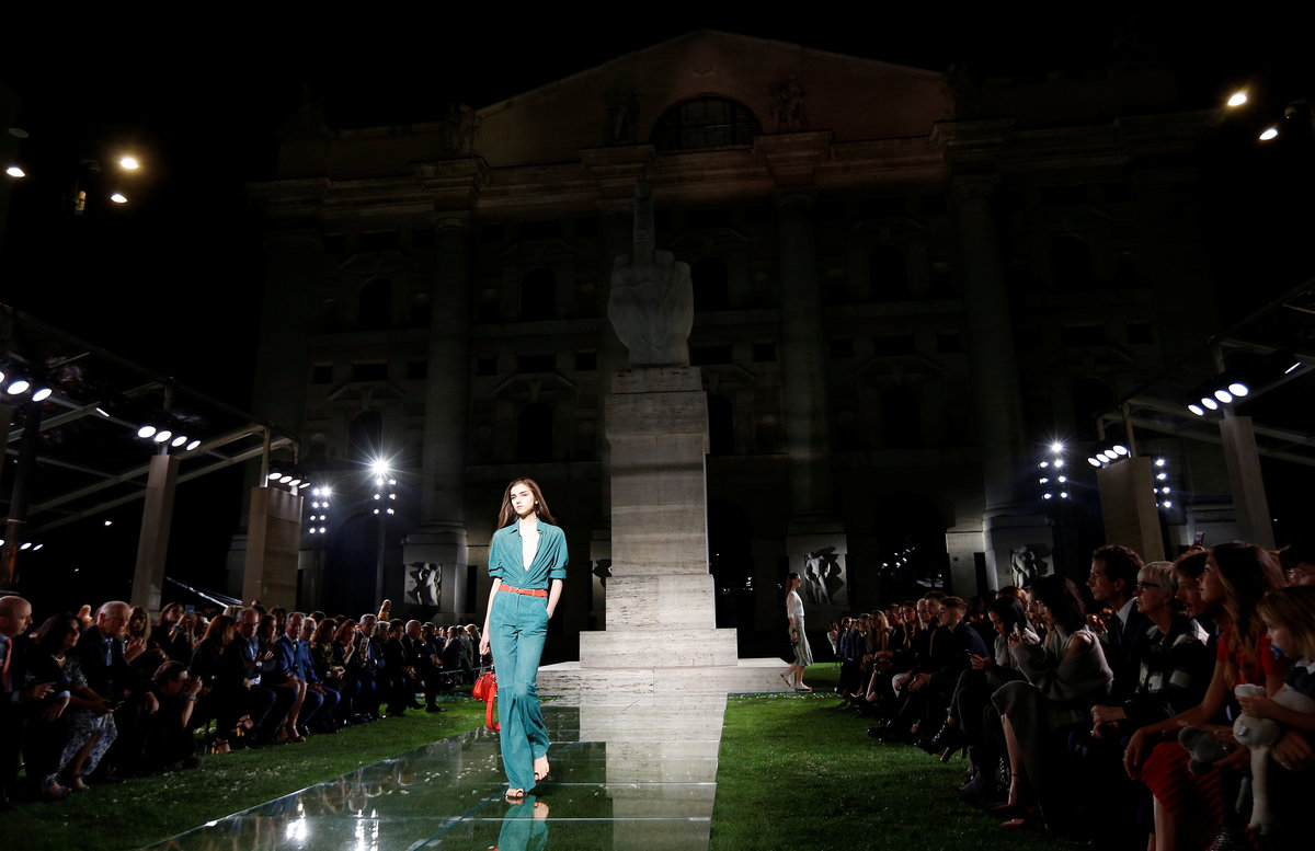 Fulvio Rigoni, director for Ferragamo's women's ready to wear, showcased his spring summer 2018 collection on a lawn under the stars, set up for the occasion in front of Palazzo Mezzanotte, the stock exchange in Italy's fashion capital.