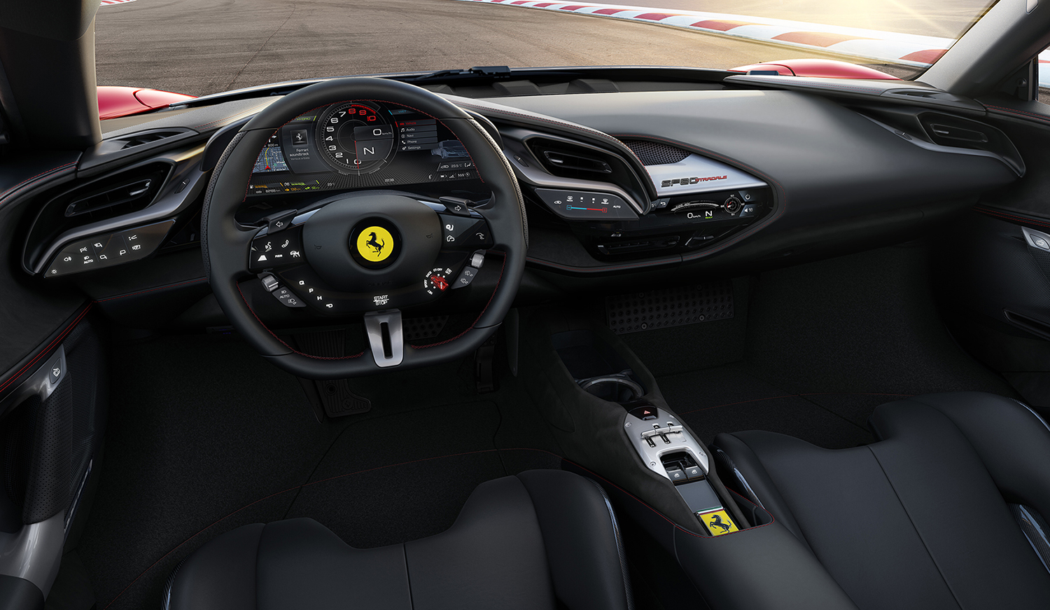 This makes the SF90 Stradale Ferrari’s first all-wheel drive sports car. And with a combined output of 1,000hp, the SF90 can sprint from 0-100kph in 2.5sec and 0-200kph in 6.7sec before maxing out at 340kph.