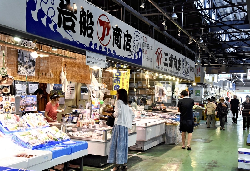 Gyosai Ichiba, a market located in the heart of Miyako, has 24 shops and restaurants mainly offering marine products. The number of tourists visiting in the hours after the ferry's arrival has increased.