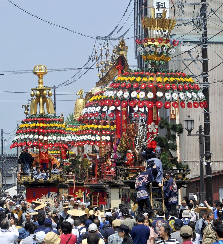 Floats decorated with gold and Japanese lacquer parade through the streets Tuesday as part of the more than 400-year-old Takaoka Mikurumayama Festival in Takaoka, Toyama Prefecture. The floats took one year to prepare, according to an association dedicated to preserving them. The festival was added to UNESCO's Intangible Cultural Heritage list in 2016.