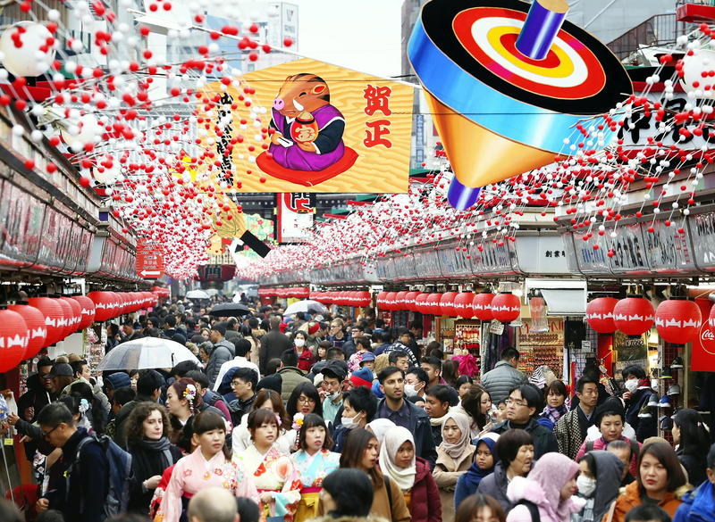 A large ema wooden plaque adorned with the image of a boar, next year's zodiac symbol, is among the New Year's decorations displayed along the Nakamise shopping street in Asakusa, Taito Ward, Tokyo. In spite of the wet weather, many visitors took in the festive mood Saturday as the New Year approaches.