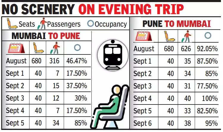 Statistics provided by the Central Railway show that occupancy was less than 50% in August. Barring September 5, which was a Sunday, the occupancy has been low this month as well so far. On the other hand, the vistadome coach has been popular among passengers on the Pune-Mumbai route, with occupancy touching 95%.