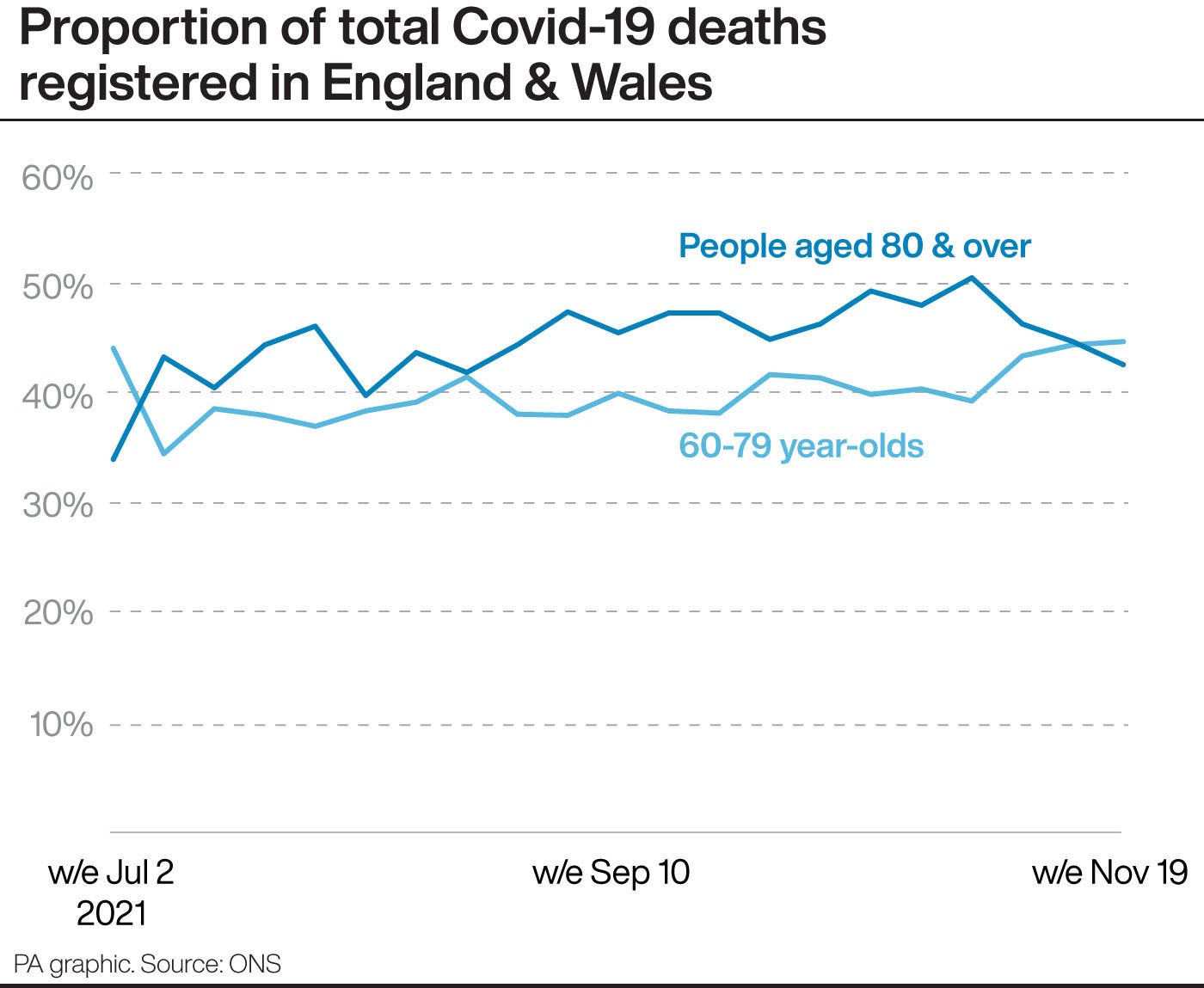 A total of 42.5% of deaths involving coronavirus registered in England and Wales in the week ending November 19 were among over-80s, while 44.6% were 60 to 79-year-olds.