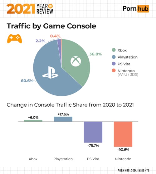 Oh, and yes, plenty of people used their gaming consoles to watch porn on the TV, too. PlayStation users represented more than 60 percent of these visitors, while Xbox users accounted for more than 36 percent. Nintendo only made up 0.4 percent of these visits, likely because the Switch doesn’t have a dedicated web browser. Guess some folks are still using their 3DS and WiiU for that?