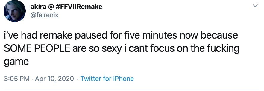 The boxy polygons from the 1997 original and awkwardly translated dialogue have been replaced by gorgeously rendered animations and top-notch voice acting. FF7 Remake transports you to a vibrant, anime-inspired world where all the key players are ridiculously hot and very interested in flirting. Judging from the chatter surrounding the game on Twitter, we're not the only ones picking up on these frisky vibes.