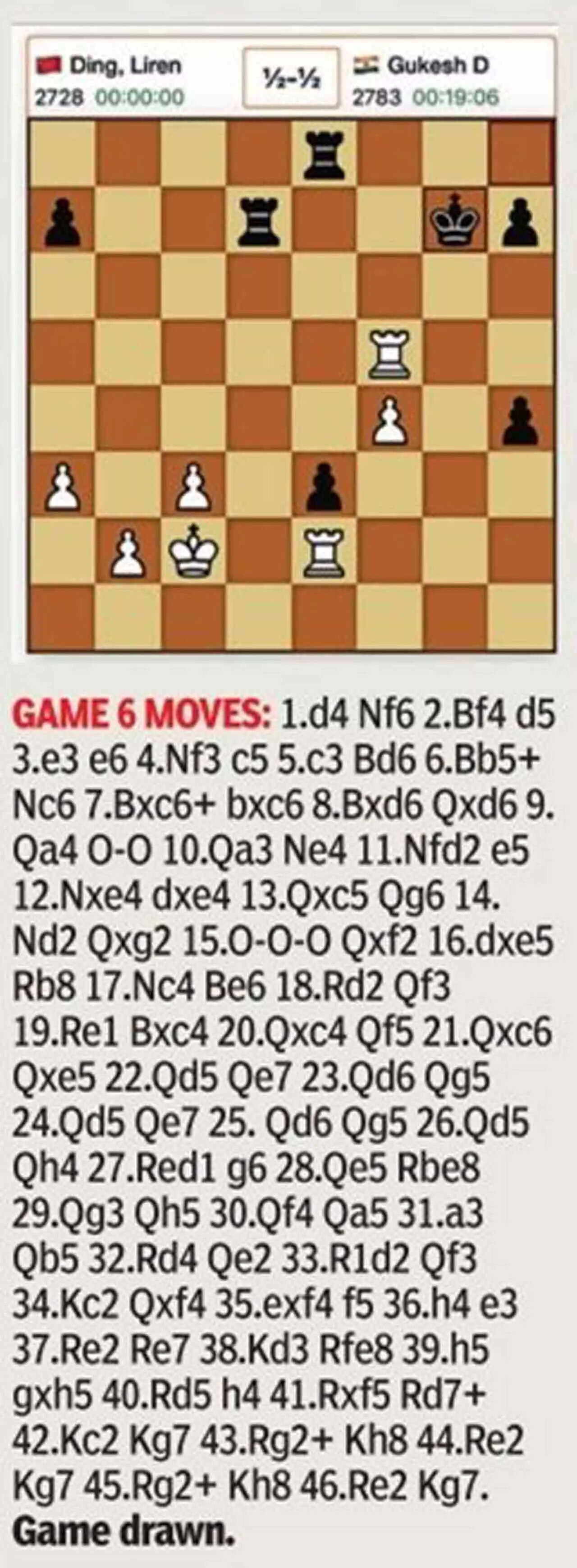And it lived up to expectation with Gukesh refusing to play a passive role. In queen, double rook and pawns endgame, Ding had a more pleasant position structurally, but Gukesh's queen was more active and made deep inroads asking Ding to prove his superiority. The Indian opted for the peace treaty only after queens were exchanged and his scattered pawns became less potent.