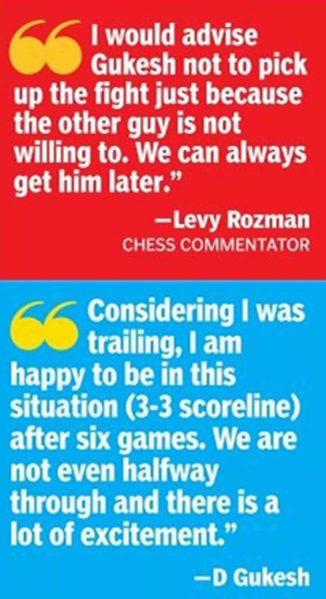On Ding losing a chance to gain a bigger advantage against Gukesh in the previous game (the fifth on Saturday) despite having white pieces, Anand said, "Going by his expressions after the game, Ding did not realise that he was better. He is still finding his feet and confidence." Going by Gukesh's own reaction on Sunday, even he was trying to figure out why others were considering his position to be worse.