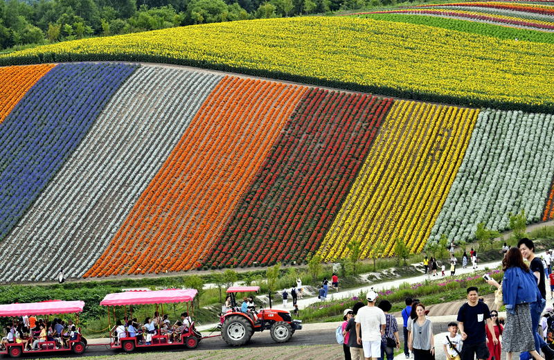Summer blooms cover fields in colorful patchwork-like patterns at Shikisai-no-oka in Biei, Hokkaido. Flowers have grown slowly at the popular tourist spot this year because of lower-than-usual temperatures in July, according to a Shikisai-no-oka official. About 40 kinds of flowers will continue to bloom at the 14-hectare garden until around October.