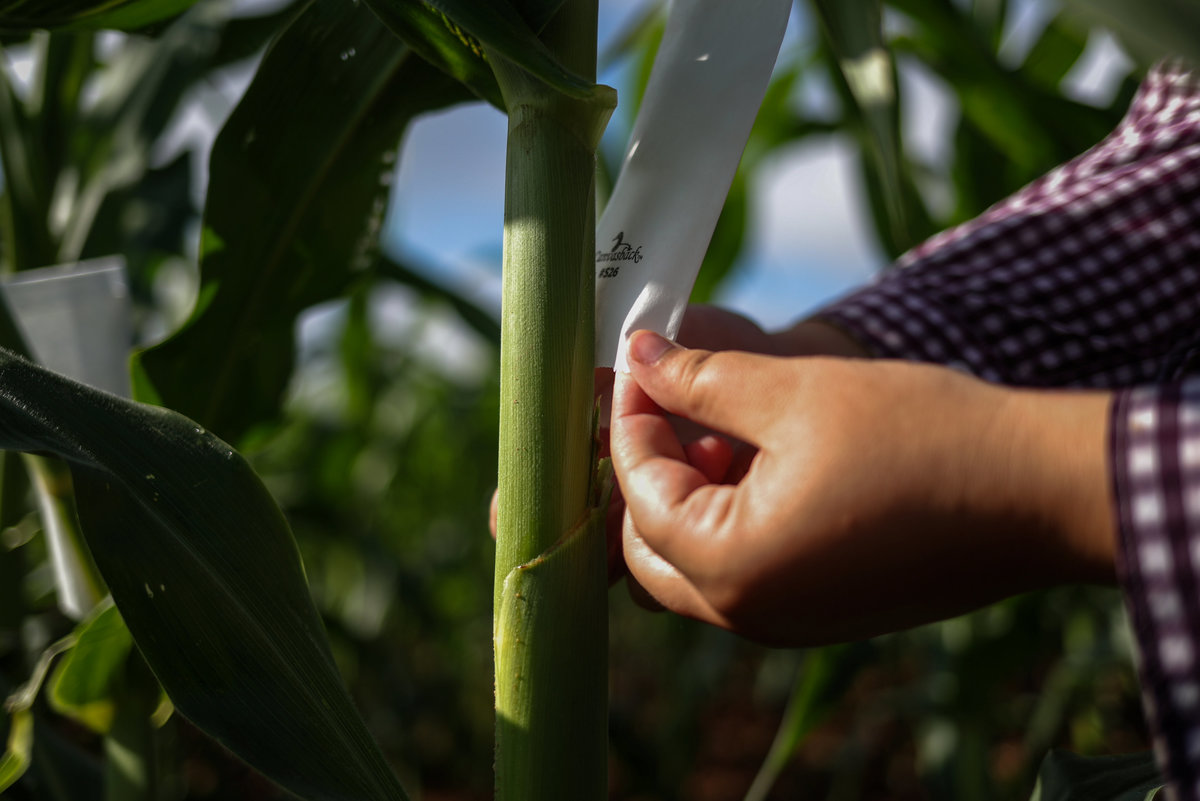 A Ph.D. candidate at Texas A&M University covers the shoot of a of corn plant so pollination can be controlled by hand in a corn research field in College Station, Texas, U.S., May 23, 2018. Picture taken on May 23, 2018. REUTERS/Adrees Latif