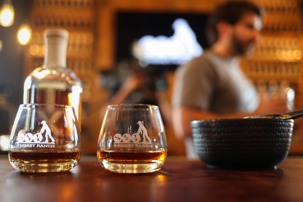 Rob Arnold, head distiller, stands in the background of glasses holding TX Whiskey (L) and TX Bourbon at the TX Tavern at the Firestone & Robertson (F&R) Whiskey Ranch in Forth Worth, Texas, U.S., May 23, 2018. Picture taken May 23, 2018. REUTERS/Adrees Latif