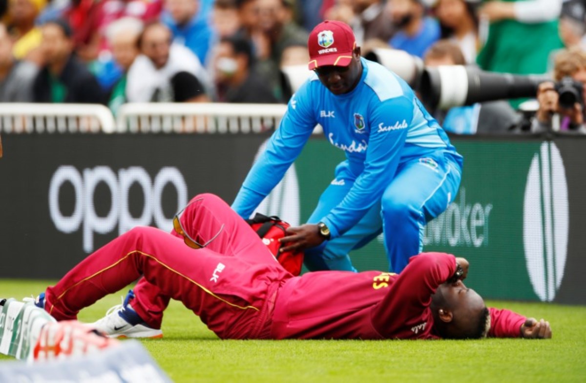 Cricket - ICC Cricket World Cup - West Indies v Pakistan - Trent Bridge, Nottingham, Britain - May 31, 2019 West Indies' Andre Russell receives treatment from a physio after sustaining an injury Action Images via Reuters/Jason Cairnduff