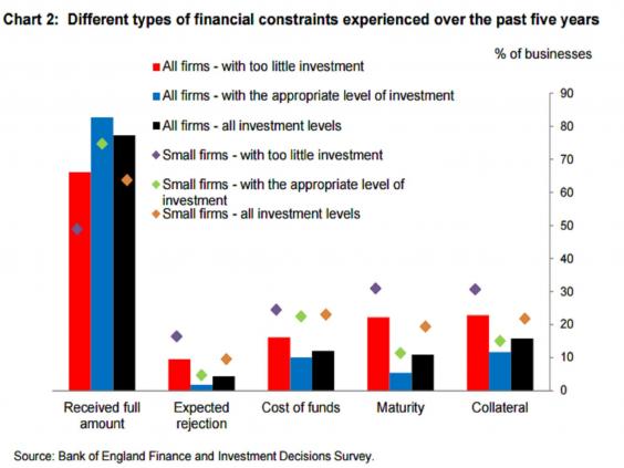 And of these under-investors two thirds (20 per cent of all firms) said the reason was constraints on borrowing, including expectations of their loan application being rejected by banks, the demanded cost of the funds, the maturity on the repayment and the onerous collateral demands made by lenders.