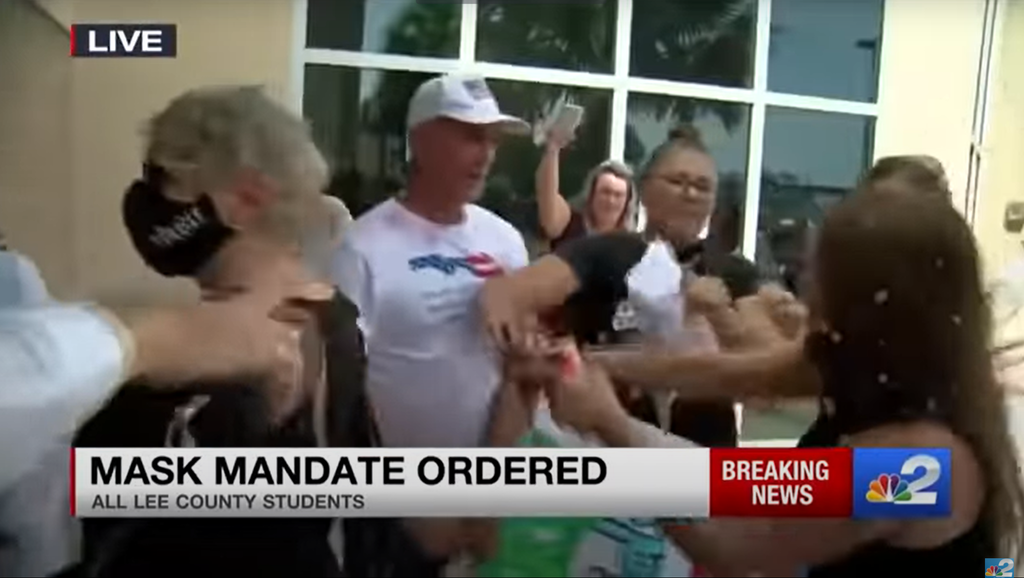 The scene was captured on a local news broadcast at the headquarters of Lee County School District, about 165 miles west of Miami, after the superintendent imposed a 30-day mask mandate without consulting parents or holding a vote.