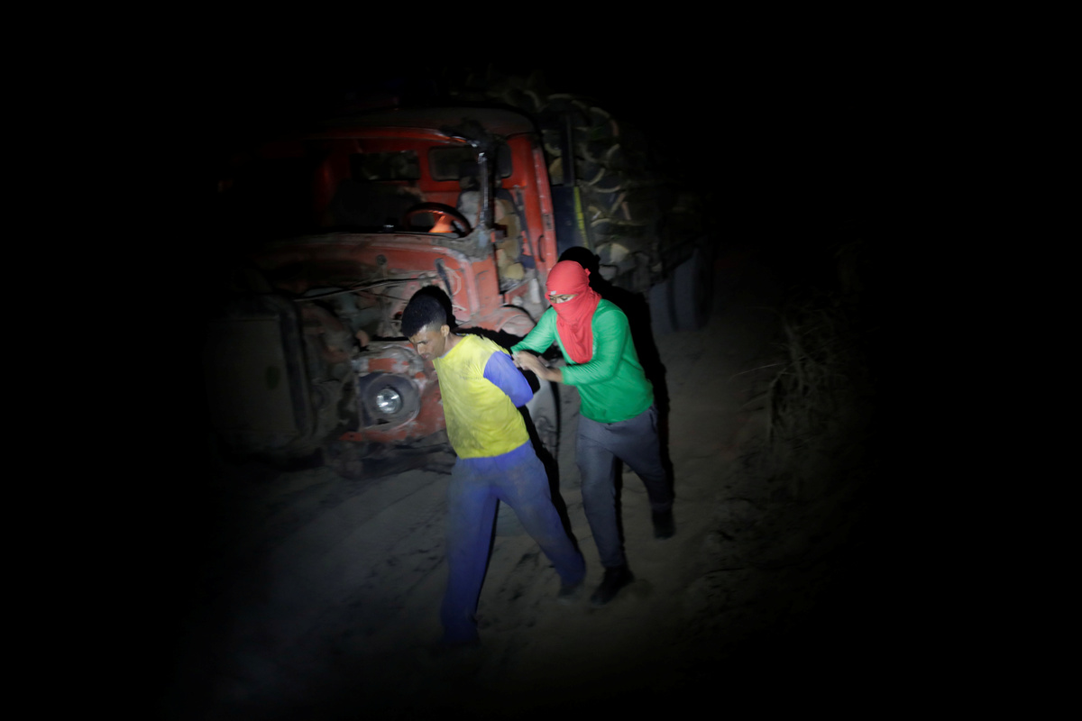 When the trucks arrive, the guardians block the road with a 4x4 of their own. The loggers, who number around eight, fire a gunshot. The guardians fire back, and the loggers scatter into the forest.