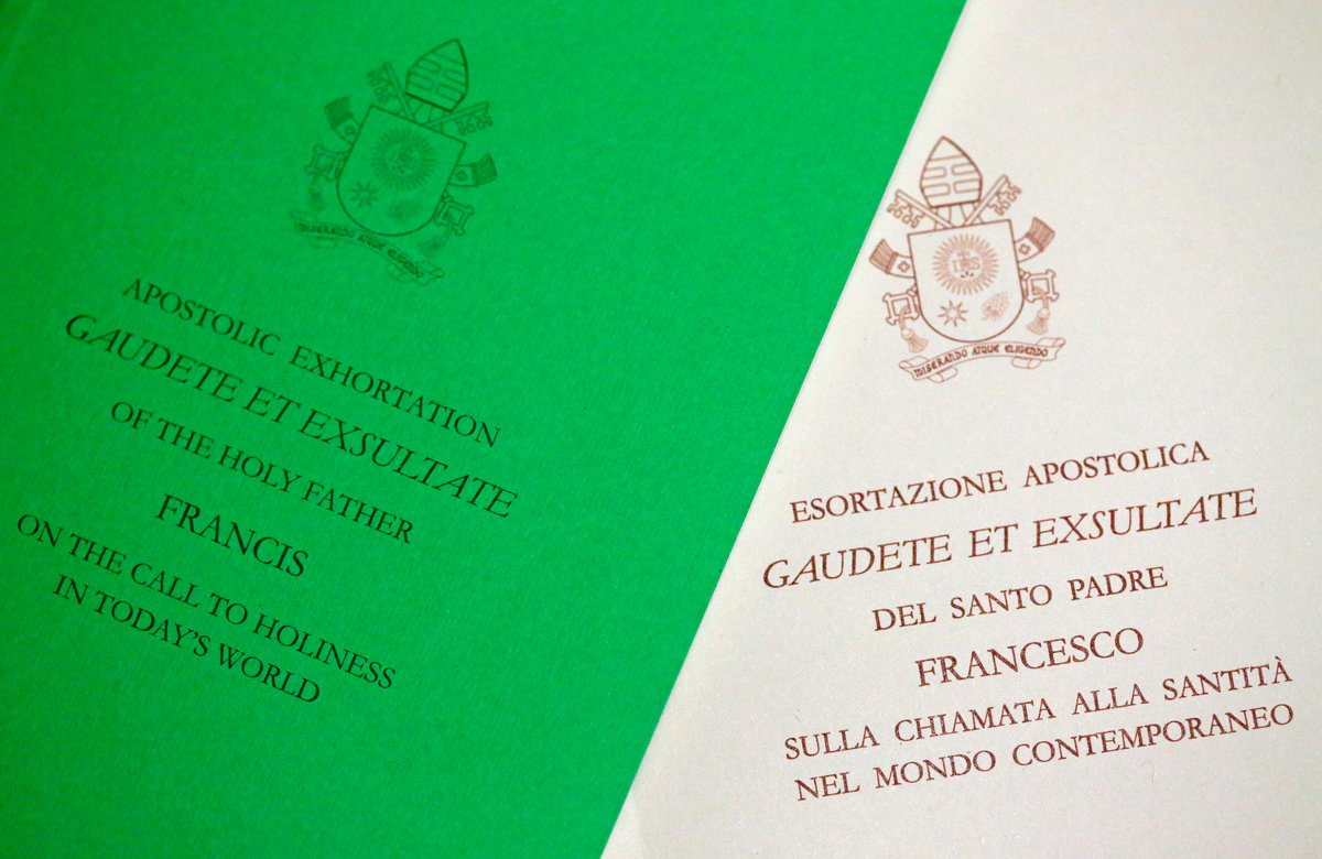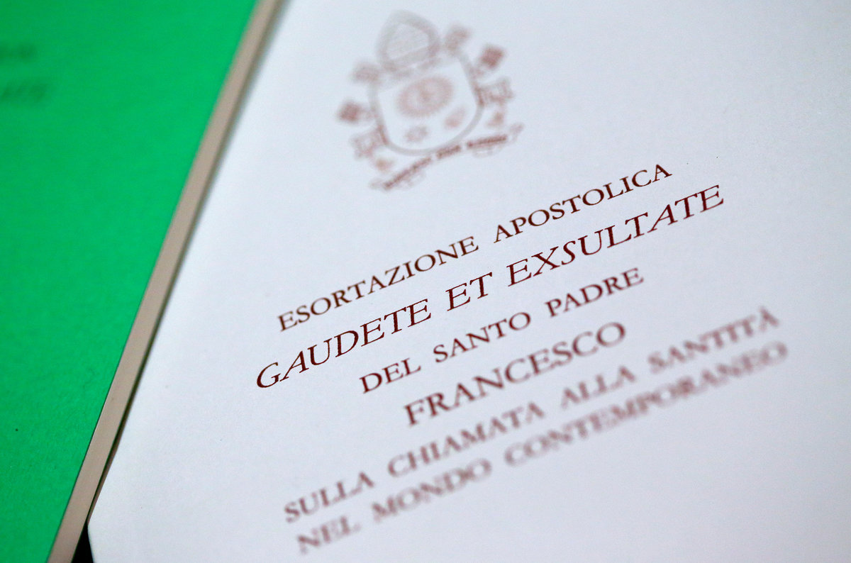 The pope made his appeal in a major document known as an Apostolic Exhortation called "Gaudete et Exsultate" (Rejoice and be Glad), a 100-page booklet on how people can be holy in a modern world filled with secular distractions and materialism.