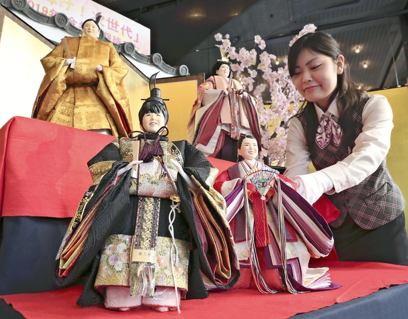 Hina dolls miniaturizing figure skater Rika Kihira, front right, who won the ISU Grand Prix Final in December, and shogi seven-dan player Sota Fujii, front left, are on display until Friday at the shop of famous doll maker Kyugetsu Co. in Taito Ward, Tokyo, ahead of the Hina Matsuri doll festival on March 3. The 16-year-olds were selected as next-generation icons expected to make a splash this year. Dolls of Crown Prince Naruhito and Crown Princess Masako are also displayed. These dolls are not for sale.