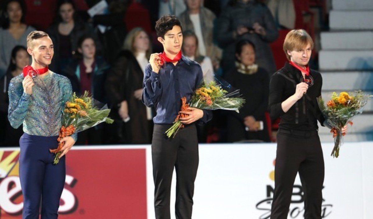 Nov 25, 2017; Lake Placid, NY, USA; Adam Rippon (USA) and Nathan Chen (USA) and Sergei Voronov (RUS) respectively won the silver and the gold and the bronze medal during the men free skating program at the 2017 Skate America figure skating competition at Olympic Center. Jean-Yves Ahern-USA TODAY Sports