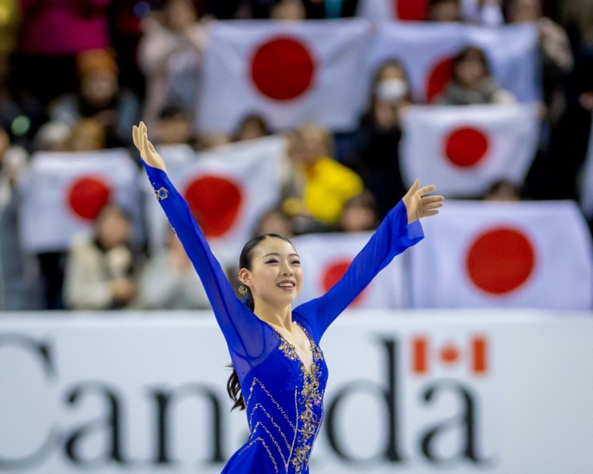 Oct 25, 2019; Kelowna, British Columbia, CAN; Rika Kihira (JPN) salute the crowd during the ladies short program at the Skate Canada International figure skating competition at Prospera Place. Mandatory Credit: Dom Gagne-USA TODAY Sports