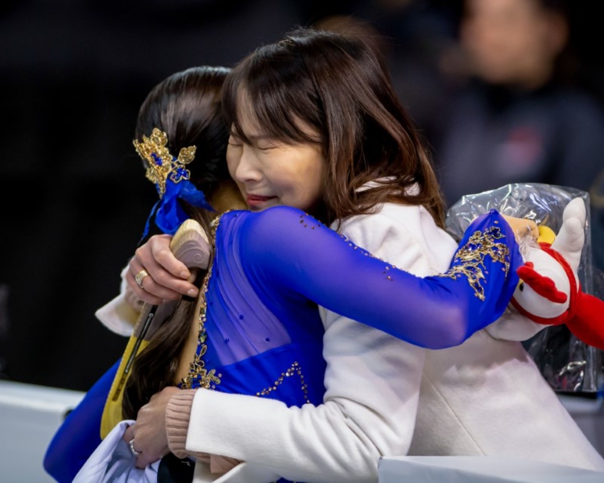 Oct 25, 2019; Kelowna, British Columbia, CAN; Rika Kihira (JPN) hugs her coach during the ladies short program at the Skate Canada International figure skating competition at Prospera Place. Mandatory Credit: Dom Gagne-USA TODAY Sports