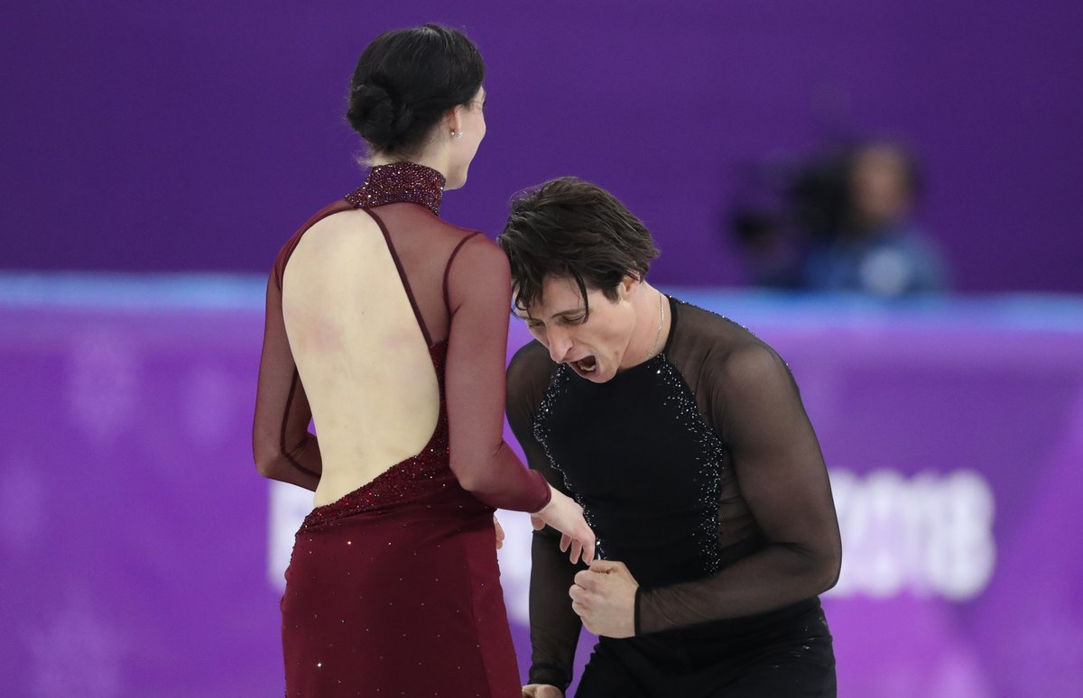 Papadakis and Cizeron struggled in their short programme on Monday after the top of Papadakis's costume came loose, and were 1.74 points behind the Canadians entering Tuesday's free dance.