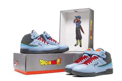 Trunks’ trademark denim jacket informs the F-13’s primarily blue makeup, with dark grey pulled from his pants and his red bandana represented on the laces. At first glance you may miss the green on FILA’s striping, which comes from Trunks’ powerful sword.