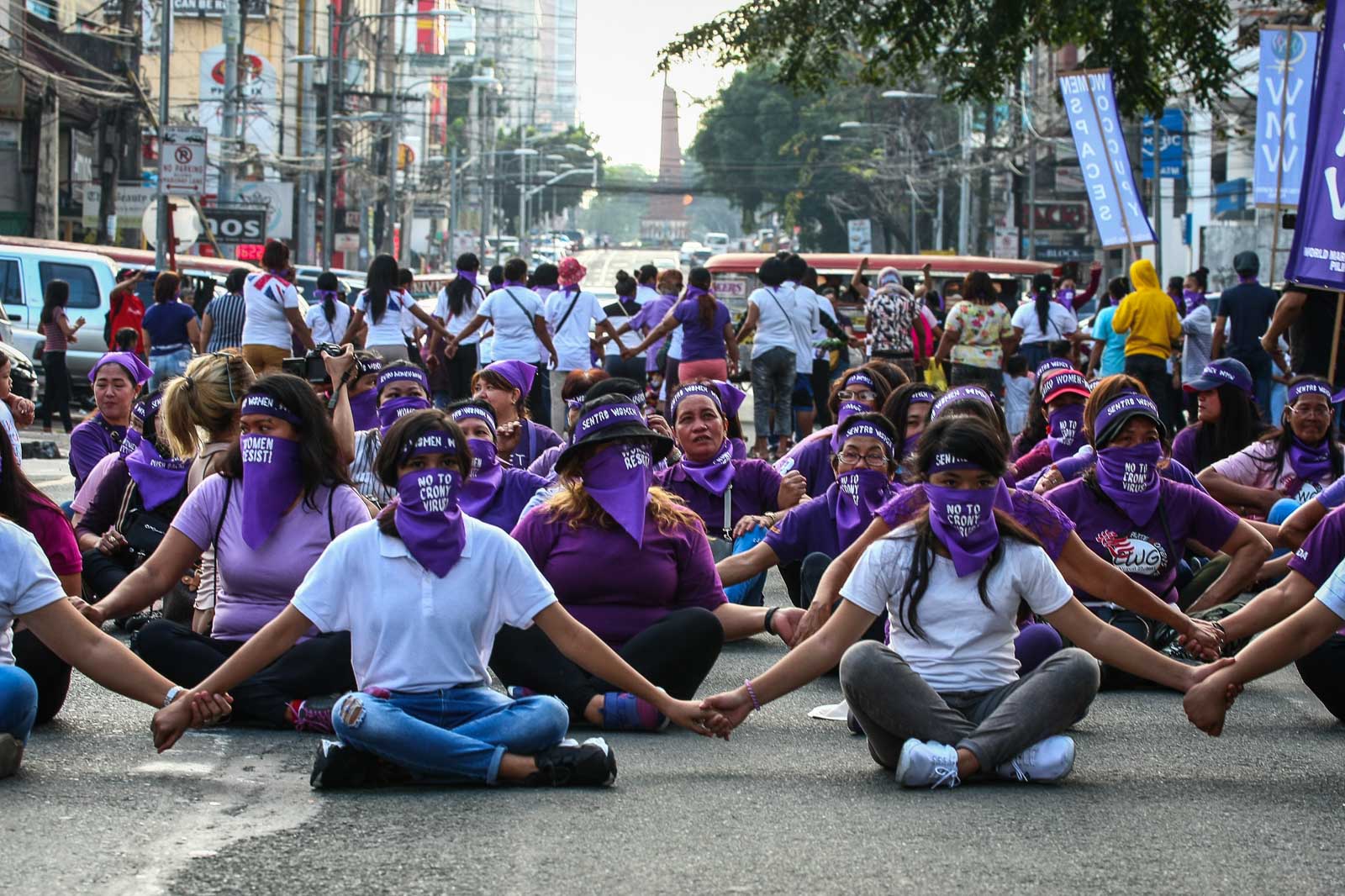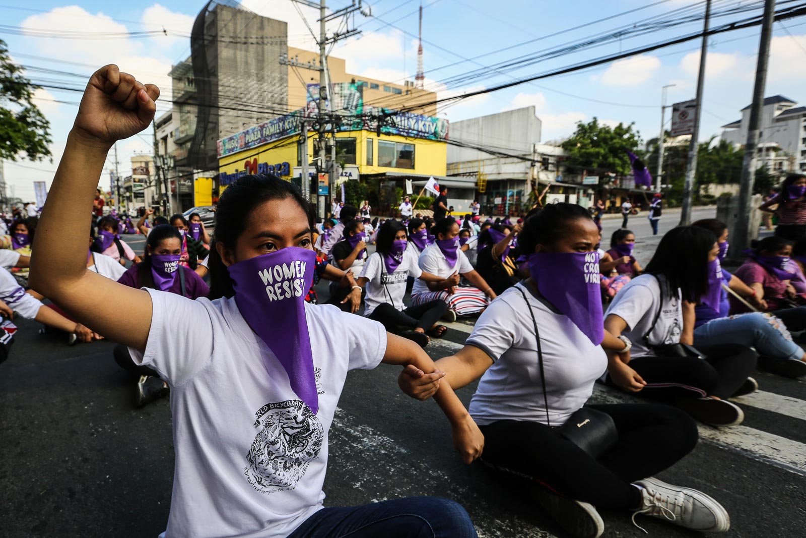More than 300 women gathered and blocked Scout Tobias and Timog roads in Quezon City as they symbolically pushed back against narrowing political spaces for women in the administration of President Rodrigo Duterte.