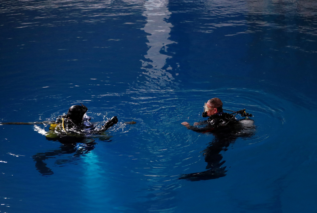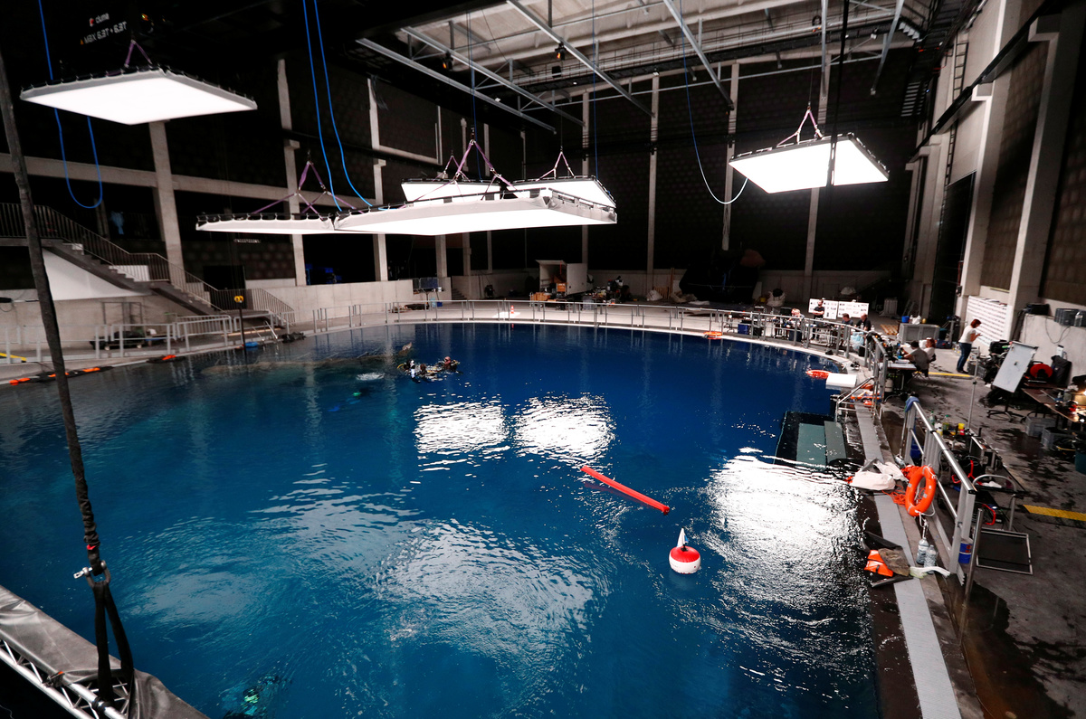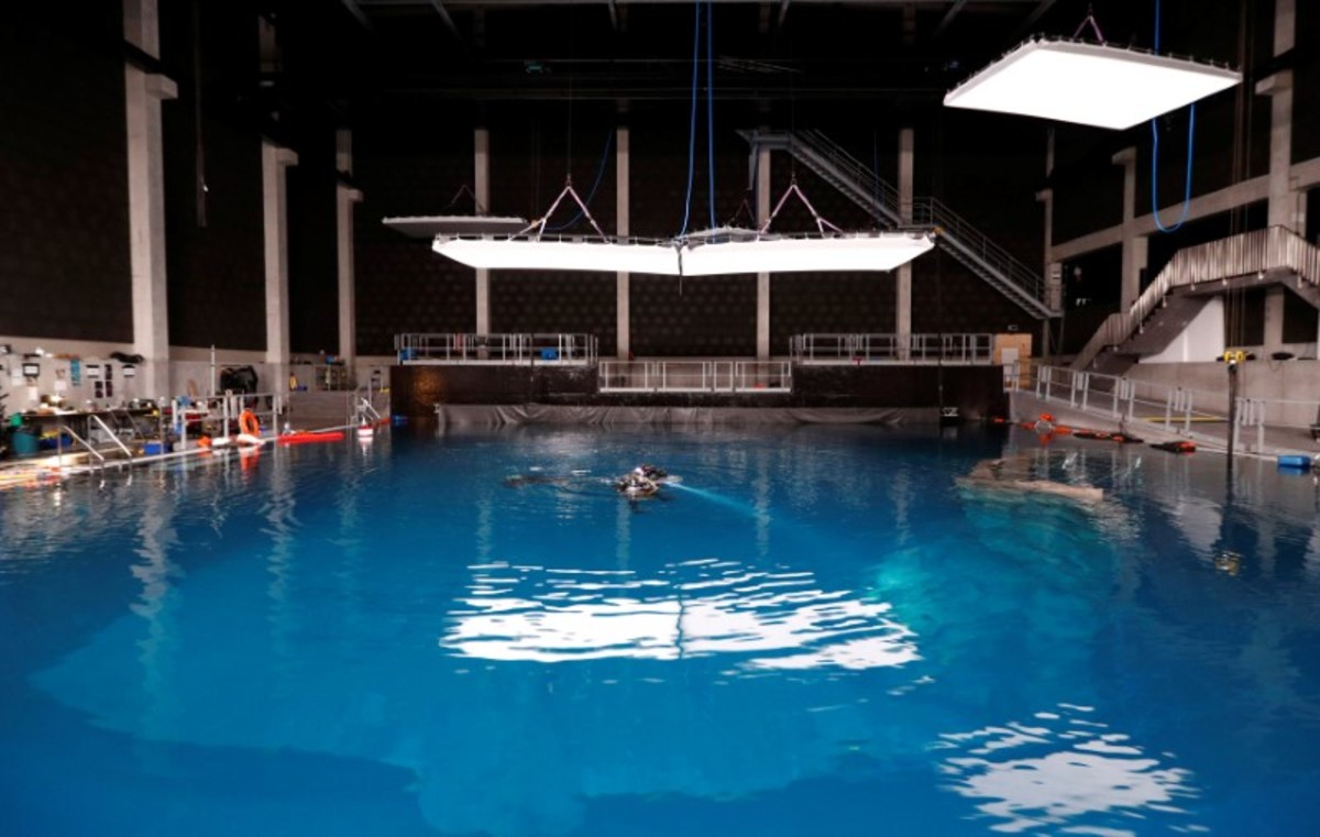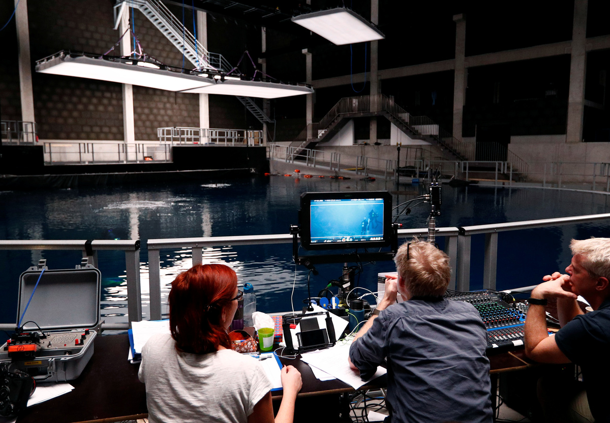 The studio includes a moveable floor that means sets constructed on dry land can be lowered into the water. Poolside cranes lift in boats or other props, and staff are on hand to train actors.