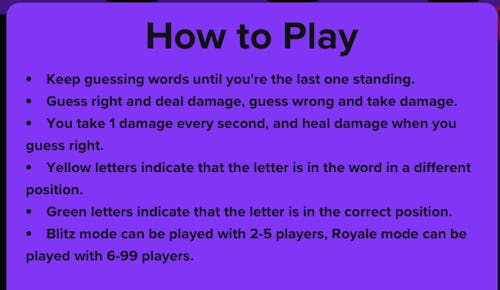 The major difference from Wordle, aside from the multiplayer aspect, is that players experience a time crisis of sorts while trying to guess the correct word. Players begin with 100 HP and lose one health point every second. Damage is healed for every correct guess, while incorrect guesses deal damage to the player.