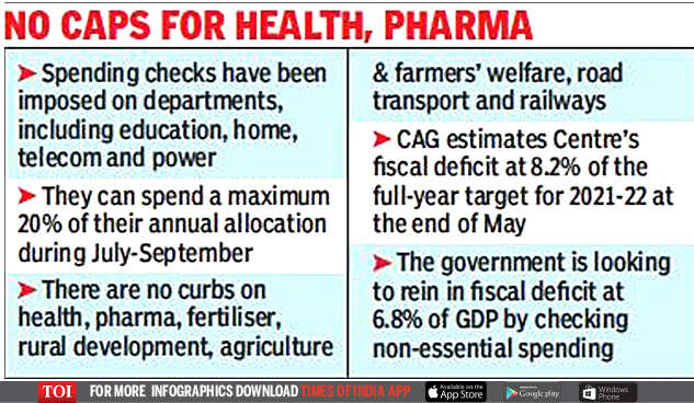 NEW DELHI: The finance ministry on Wednesday imposed spending checks on several departments, ranging from education and home to telecom and power, as part of a cash management exercise due to the “evolving” Covid-19 situation and the Centre’s cash management requirements.