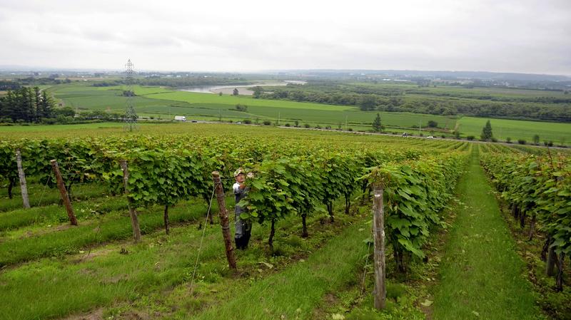 IKEDA, Hokkaido -- Climbing a small hill overlooking the Tokachi Plain, I could see straight rows of grape trees. The landscape was beautiful -- it looked like someone had drawn lines with a green marker. I was visiting an about 17-hectare vineyard in the town of Ikeda, Hokkaido, the production center for one of the nation's major wines.